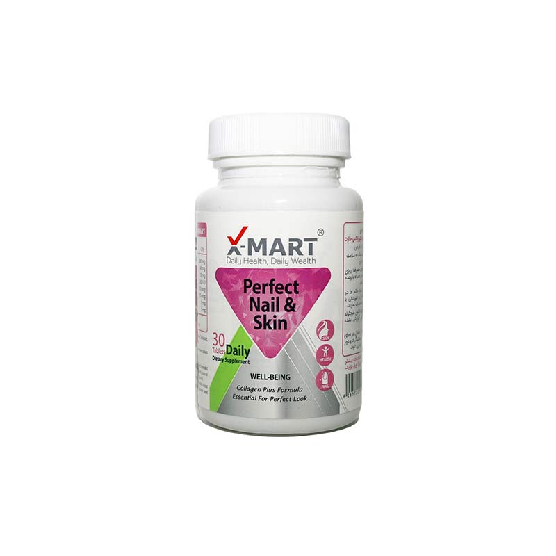 قرص پرفکت نیل اند اسکین ایکس مارت Xmart Perfect Nail & Skin مکملی برای حفظ سلامت پوست و ناخن با ترکیبات ویژه است. این محصول حاوی 500 میلی گرم کلاژن هیدرولیز شده است. کلاژن عضو اصلی ساختمان پوست و مو و ناخن است. علاوه بر کلاژن در ایکس مارت ترکیباتی چون ویتامین سی، زینک (روی)، بیوتین که این سه ترکیب نیز تاثیر مفیدی بر حفظ سلامت پوست و مو دارند و همچنین این محصول حاوی ویتامین د۳، سلنیوم، مس و منگنز می باشد.