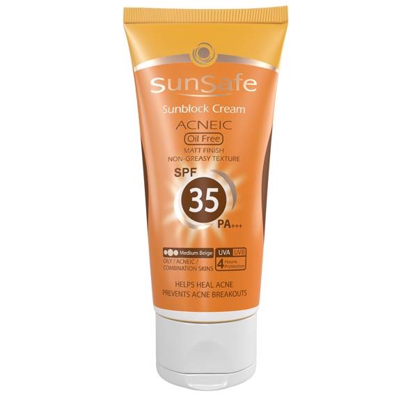 کرم ضد آفتاب SPF35 فاقد چربی مناسب پوست چرب و آکنه ای سان سیف (بژ متوسط)